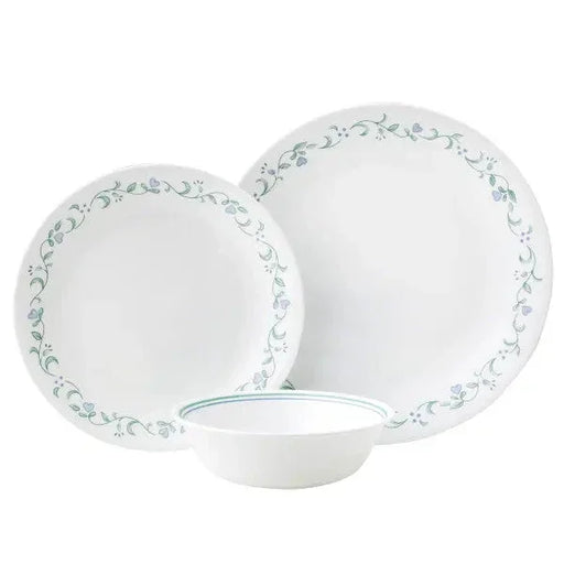 Corelle Country Cottage Vitrelle 12pc Plate Bowl Set Periwinkle-blue blossoms and hearts embellish this lunch plate with petal-soft colour. The la...