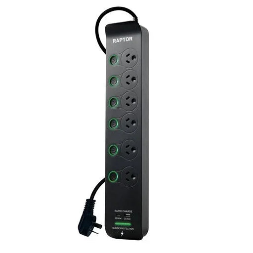 JACKSON 6-Way Raptor Powerboard with Surge & Overload Protection. 6x Individual Push Button LED On/Off Indicator Switch. Rapid Charge 30W USB ...