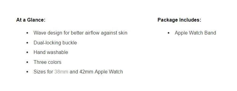 The Sport Band comes in a choice of three sporty colors and is available in Apple Watch 38mm or 42mm compatible sizes. The dual-locking buckle also stays secure on your wrist to ensure full sensory engagement throughout your workout.