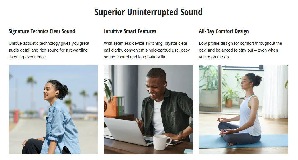 Compact yet powerful 6mm drivers and a special acoustic structure with active noise cancellation deliver clear sound wirelessly — wherever your busy day takes you. Seamless device switching and crisp call clarity in a comfortable design – you won't miss a beat.